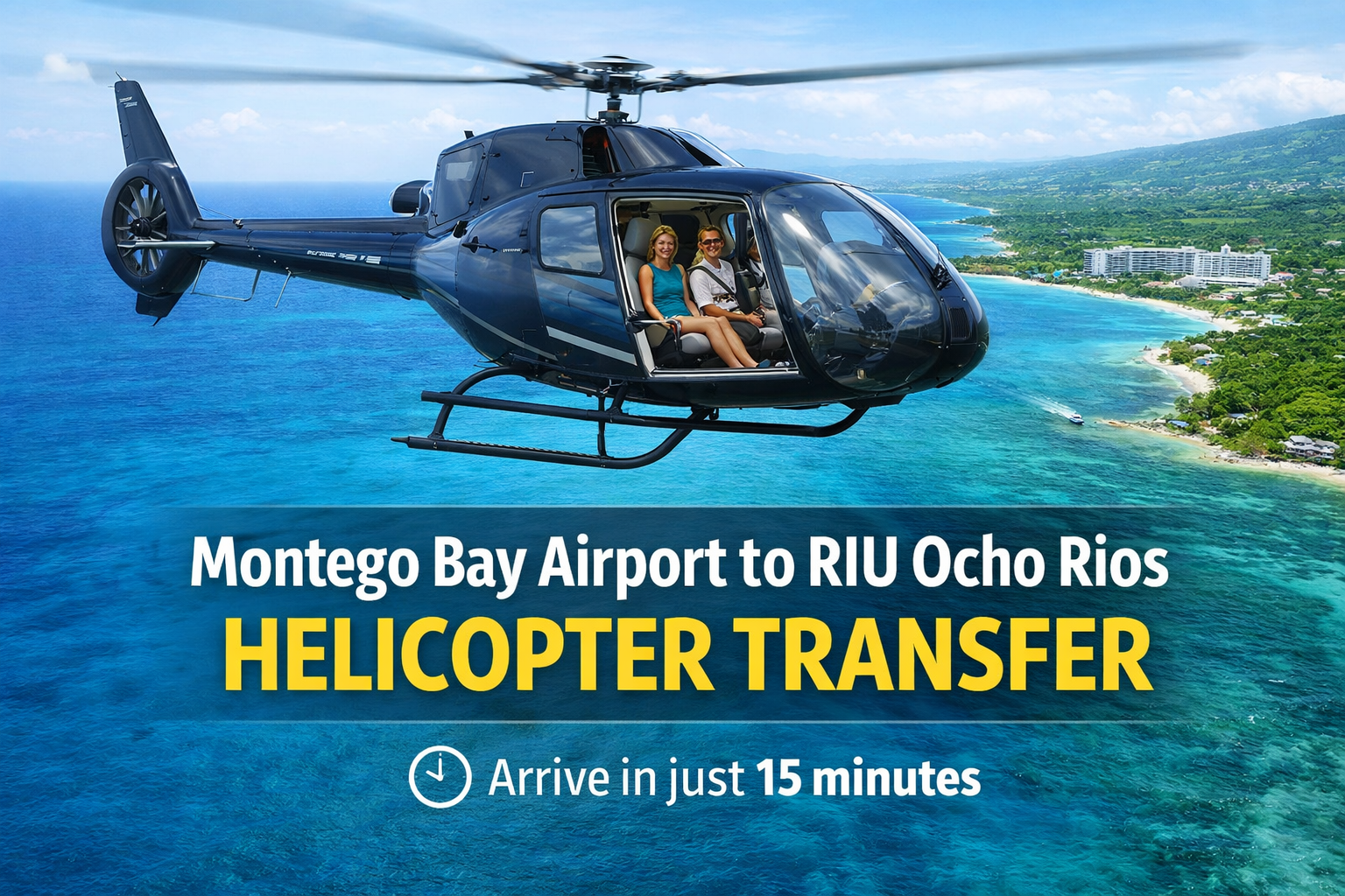 Arrive in 15 minutes with stunning aerial views. Luxury, fast, and unforgettable travel experience. Turn your arrival into a VIP experience with our exclusive helicopter transfer from Montego Bay Airport to RIU Ocho Rios.