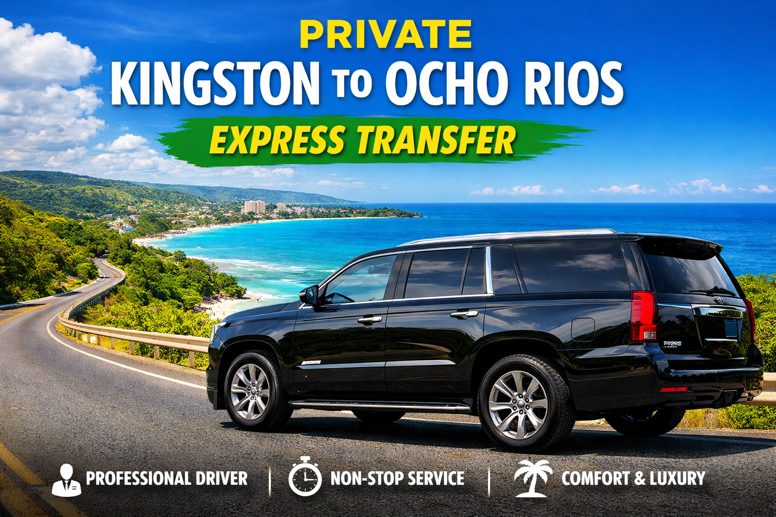 Enjoy a smooth, comfortable, and stress-free journey across Jamaica with our Private Kingston to Ocho Rios Express Transfer, designed for travelers who value convenience, reliability, and a premium travel experience. From the moment your professional driver greets you in Kingston, you’ll enjoy personalized service, assistance with your luggage, and a relaxing ride in a clean, air-conditioned private vehicle reserved exclusively for you. Skip crowded buses, unpredictable taxi options, and long waits, our express transfer provides direct, nonstop transportation straight to your Ocho Rios hotel, villa, or Airbnb. Sit back and take in the scenic coastal views and lush mountain landscapes as we ensure a smooth, safe, and enjoyable trip along one of Jamaica’s most beautiful routes. Book today and travel with peace of mind from city to coast.